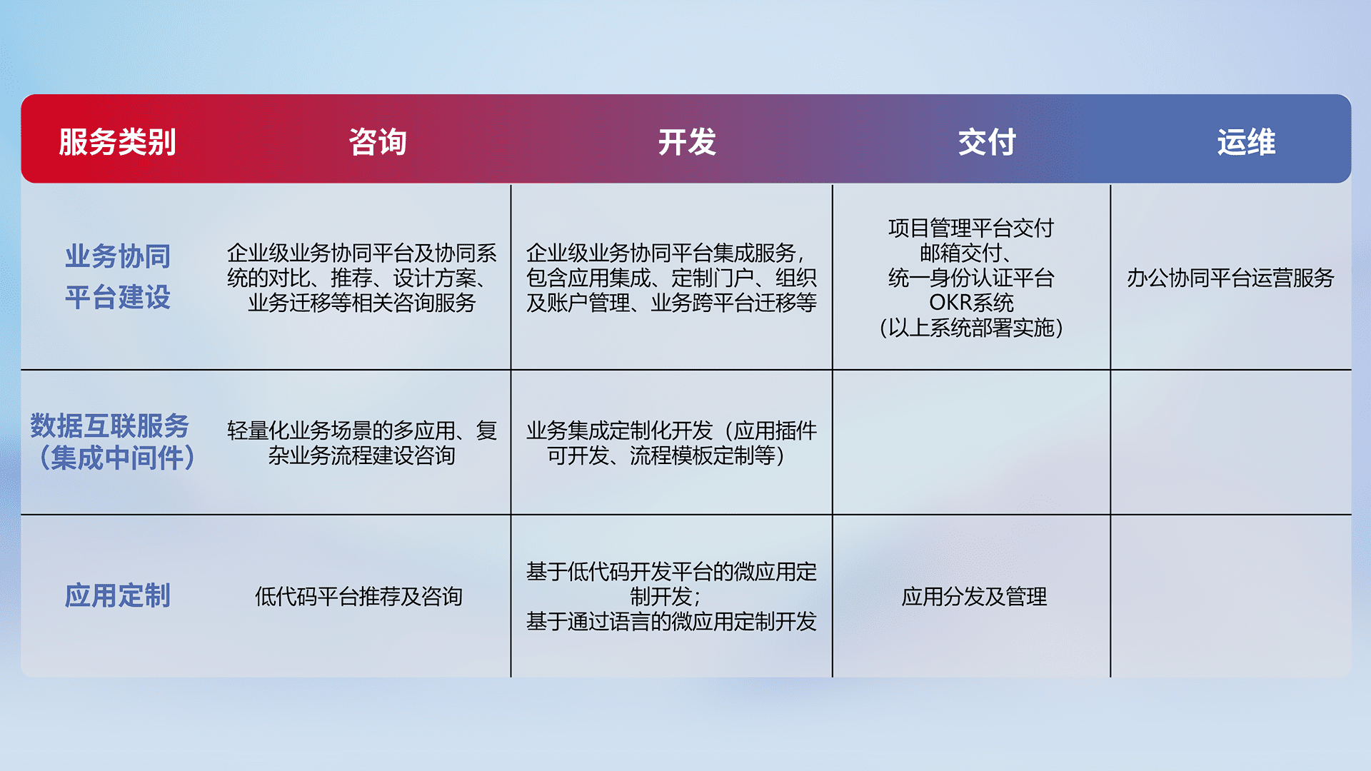 针对钉钉、、、企微、、IDaas等平台级产品提供产品的规划、、方案、、、、交付、、、、定制化开发等服务,,实现如统一协同办公、、、、智能客户服务、、混合会议管理、、、、智能数据查询、、等业务场景,,,实现数字化转型。。